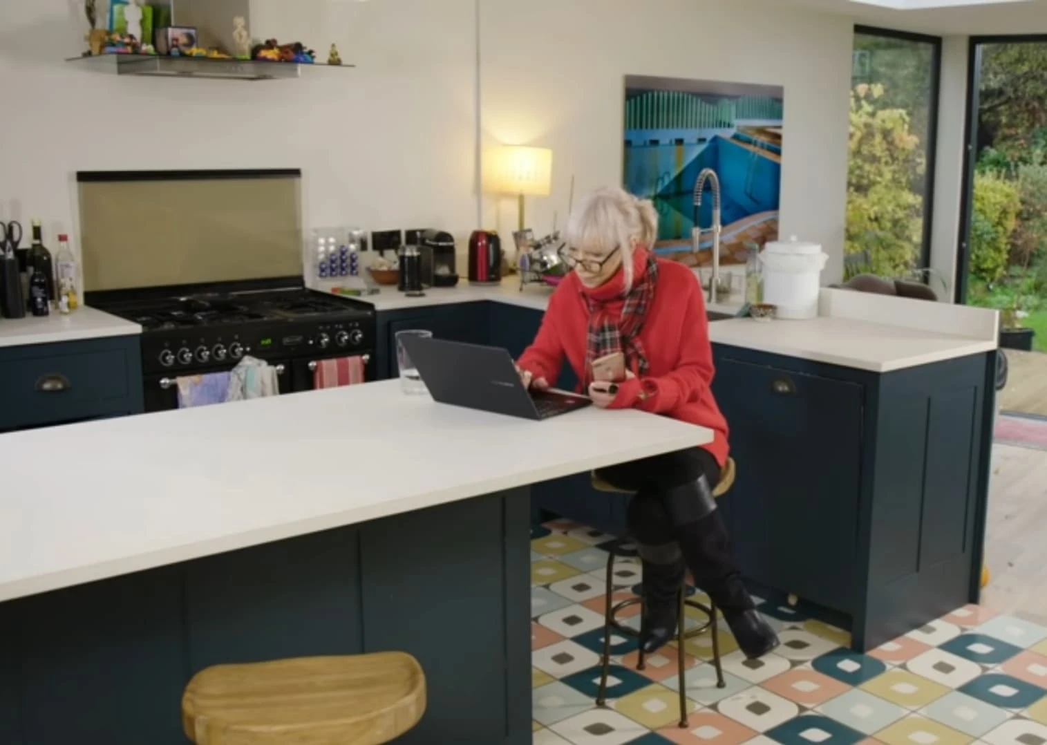 The kitchen consisted of black cabinets with white surface tops, with various ingredients and items such as a kettle adorning the surface. There was an "island" and an oven, and there was a shelf with various personal items placed on top as well as a painting on the wall depicting a swimming pool. There was also a double glass door leading directly into the garden.