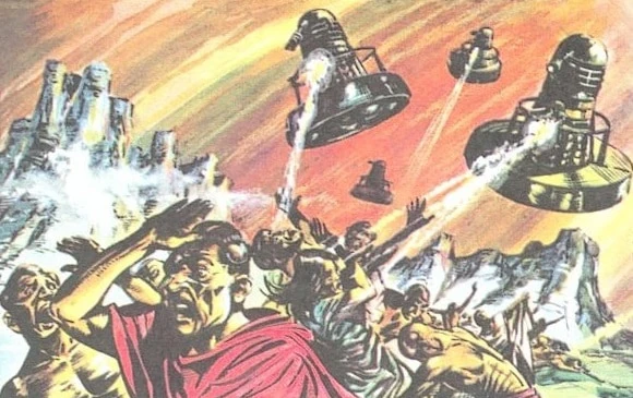 The Daleks exterminate the primitive races of Jupiter's moons. (COMIC: Invasion of the Daleks)