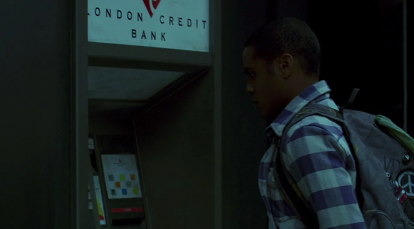 Clyde in front of a cashpoint of the London Credit Bank (TV: The Curse of Clyde Langer)