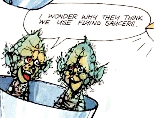 - One alien wonders why humans think extraterrestrials fly in flying saucers.