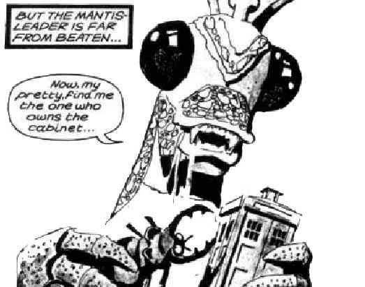 The Tyrryxians sent their battle fleet in pursuit of the Mantis, but one of the ship's devices could shrink or enlarge the ship or any object aboard it. They used it to shrink themselves to particulate size to avoid detection, but while they were still in giant mode, the Doctor's TARDIS materialised on board. The Mantis leader discovered the TARDIS and experimented on it to find out what it was, subjecting it to acid and x-rays. Learning that it was a dimensionally transcendental craft, he forced the Third Doctor out and demanded that he reveal his scientific secrets. The Doctor escaped, made contact with miniaturised Tyrryxians, and they worked together to get the leader on board the TARDIS and then re-enlarge it, destroying the stolen spacecraft. The leader was miniaturised and imprisoned. (COMIC: Size Control)