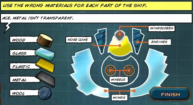 At first the player has to find out the best materials for building the space ship. So he tests out the properties the materials by dragging tools onto the materials. Then Clyde says something about the materials, forexample that they are pretty hard or are water proof. After this the player has to select the wrong materials and add them to the space ship plan which Androvax is going to use. There isn't a game over in the game. If the player chooses the right material a message appeares that the player has to choose the wrong materials and has to start again. The player can repeat his last action again and again until he finally succeeds. Only then the game ends. Only the pc mouse is needed for this game to drag and drop tools and materials.