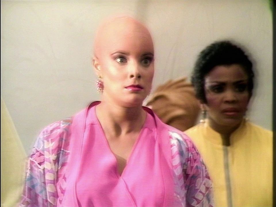 In the laboratory, the bound and gagged Peri looks questioningly up at Crozier as he silently ponders his next move regarding her. Crozier looks to the waiting Matrona and instructs her to shave Peri's head, as he has decided to attempt direct transference. Horrified, Peri screams desperately into her gag and clenches her eyes shut, but her muffled pleas are ignored as Crozier removes the medical sensors from her forehead, and the Matrona reaches over with a pair of surgical scissors and proceeds to cut Peri's hair off.