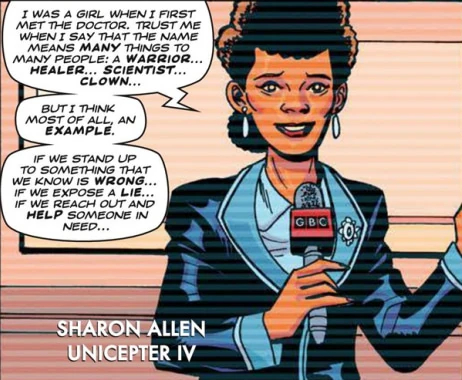 The Doctor enters the TARDIS, and Yaz tries to comfort her by showing a different news feed to Berakka's. Captain R'Takk is saying how the Doctor uncovered a conspiracy killing their people and that she is an honorary centurion of the Mobox empire, Tondi says how the Doctor ended the war between Kraytos and Tumat on Gatan, and many other aliens all share stories of how they were saved by the Doctor. Finally, it cuts to Sharon Allen mentioning how she first met the Doctor when she was a girl, and that she is an example that if everyone could expose a lie, stand up to something wrong, reach out to someone in need, then they can all be the Doctor.