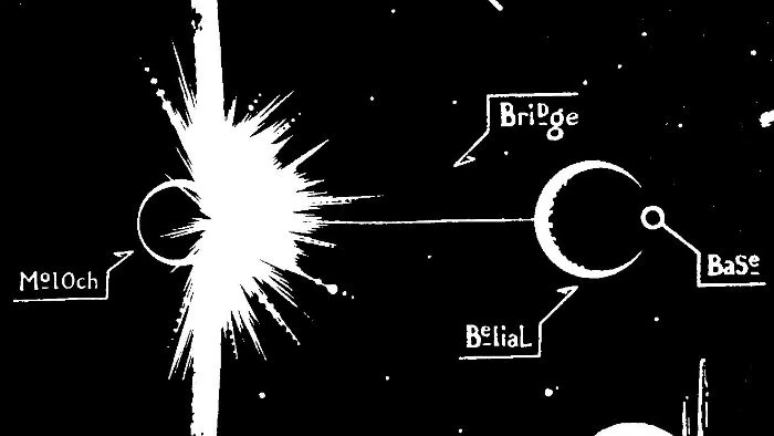 Moloch moved in geosynchronous orbit with Belial, connected by the Bridge, a thin trisilicate filament. Moloch was impossibly within Lucifer's Roche Limit, where it should have broken up.
