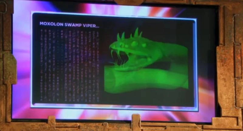 The Moxolon Swamp Vipers were snakes with horns on their heads, four eyes, long sharp teeth and a tail split in two at the end. Their bite was venomous and the venom fatal. The venom caused weakness, heightened pulse rate and increased blood pressure. (TV: The Vault of Secrets)