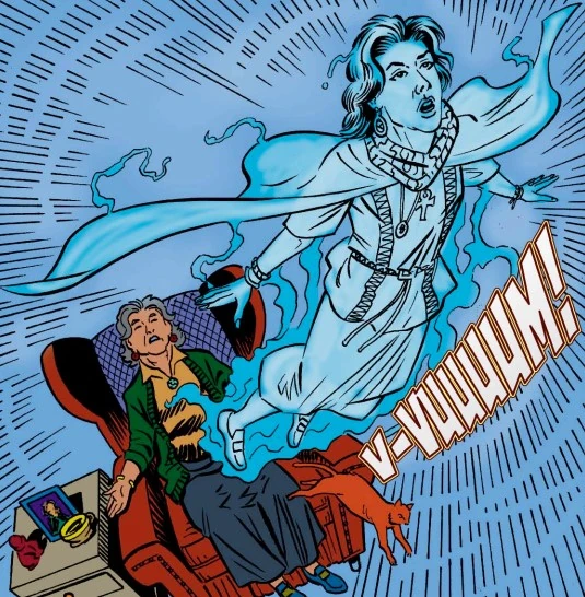 Olive astral projects herself to investigate Doctor Scorpio. (COMIC: Scorpio's Sting [+]James Hudnall, Devil's End: The Adventures of Olive Hawthorne (Lucky Comics, 2018).)