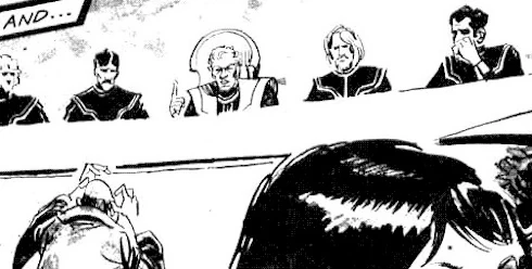The Master during his uneasy alliance with the Daleks, wearing a suit with a logo that resembles a Dalek eyespiece (TV: Frontier in Space [+]Malcolm Hulke, Doctor Who season 10 (BBC1, 1973).)