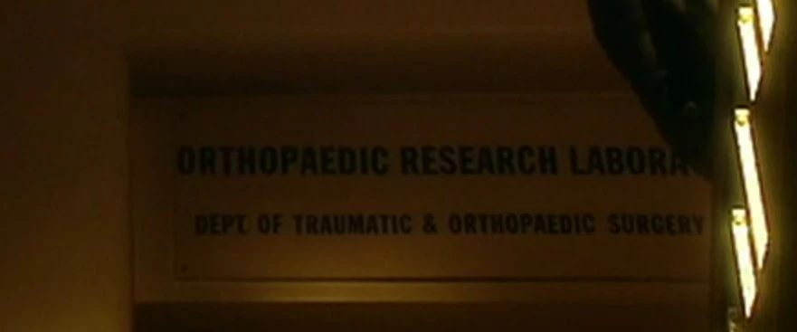 A sign reading "ORTHOPAEDIC RESEARCH LABORATORY". (TV: The Doctor Dances)