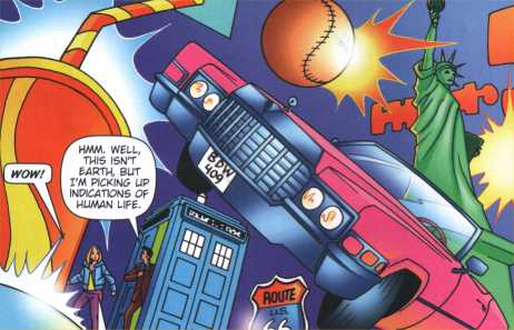Luckily, the TARDIS lands inside a giant pinball machine with a strong 1960s American theme (including the Statue of Liberty, fast food mockups, baseballs, cars and route signs). Ironically, this giant pinball table is being used to punish Gameslaves (people who spend too much time playing computer games) by forcing them to take part in a giant, real-life game by being encapsulated in one of the game's balls. Spectators decide whether the "player" gets to live, based on their game performance.
