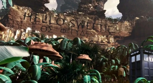 The Doctor took Amy Pond to Planet One to see the cliff face so that the TARDIS would translate the writing. When they arrived the writing revealed itself to be a message from River Song reading "Hello Sweetie" with a set of temporal co-ordinates, "ΘΣ Φ ΓΥΔϟ". (TV: The Pandorica Opens)
