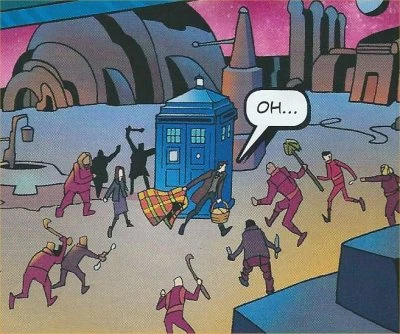 A picnic on a brand new planet "where no-one has gone before" sounds ideal but when the Eleventh Doctor and Clara arrive they are greeted by a small colony with hostility as they are feared to be from the authorities. The colonists have claimed the planet, named it "Dunroamin", and have tried to get away from the madness of the universe. But the Doctor isn't the only new arrival. An army of Drone Wreckers land on the planet (classified as 'void') with the intention of clearing the planet of visitors and putting the planet's molten core into cold storage while the atmosphere is cleaned. The Doctor quotes space regulation 466/B Imperative Alpha, which forbids demolition of a planet with new life forms. Clara meanwhile has been convincing the natives to cover themselves in jelly and pretend to be the planets native life form. The Doctor convinces Axe-L, the leader of the Wreckers, that the new lifeforms are "Jellyons". The Drone Wreckers leave the planet and returns to update Authority Records leaving the colonists to celebrate and bathe!