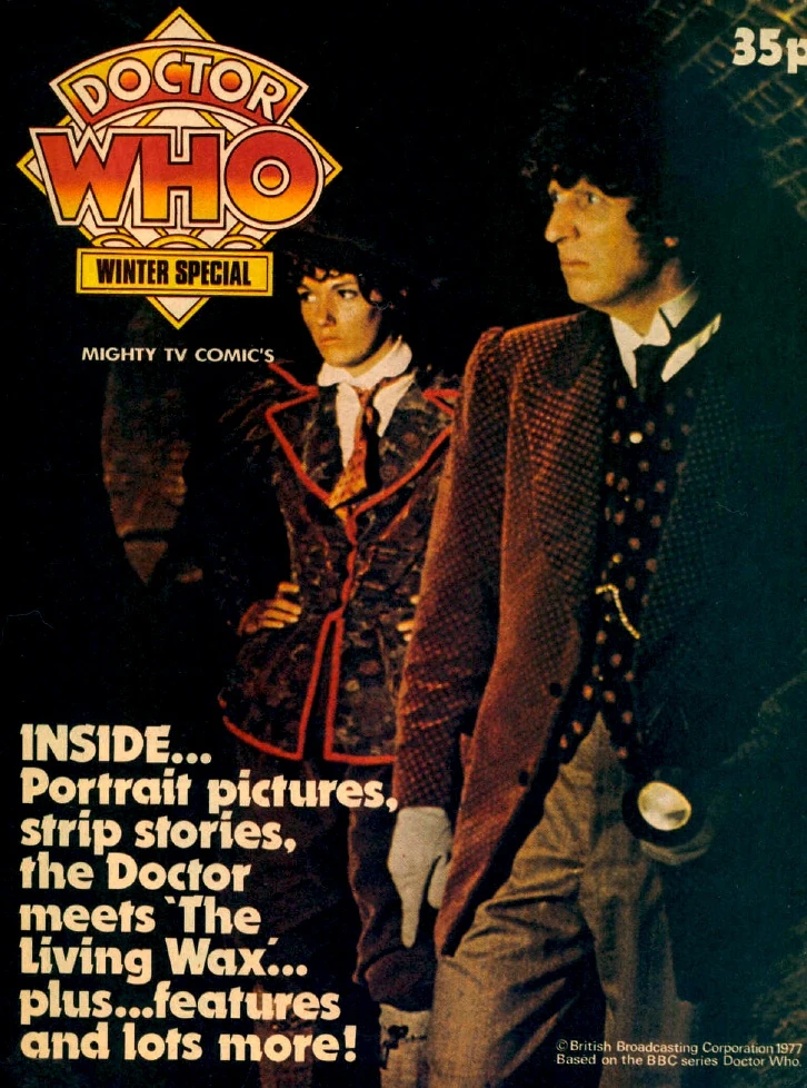 The 1977 edition nominally stars the Fourth Doctor, although the comic strips are all reprints of strips originally published in TV Action some four years earlier, with a sometimes poorly-drawn attempt at Tom Baker’s likeness drawn over that of Jon Pertwee. The publication’s one original contribution to the body of Doctor Who fiction is a short story featuring the Fourth Doctor and Leela in Victorian England, presumably devised so it could be illustrated using available photographs from The Masque of Mandragora and The Talons of Weng-Chiang.