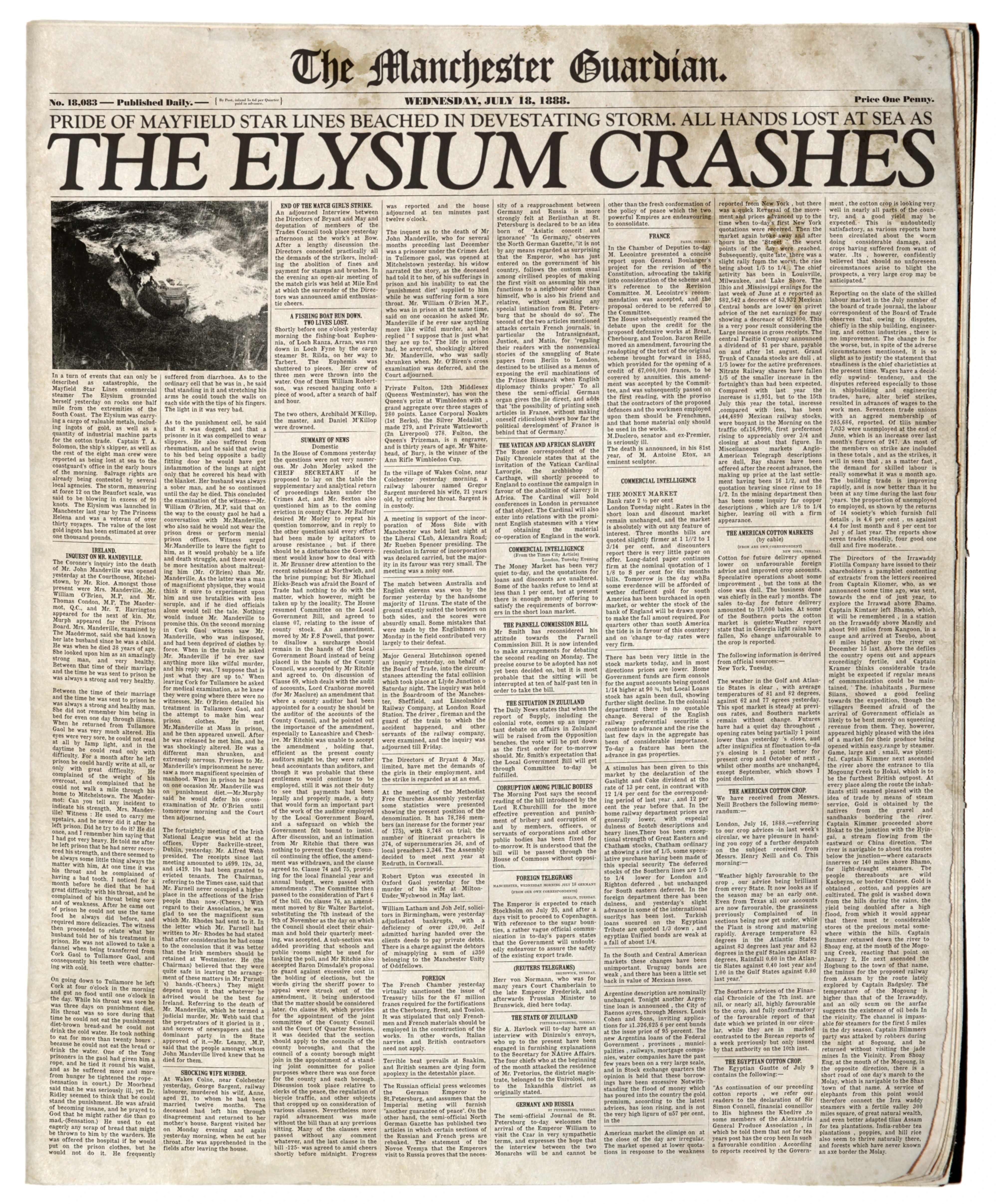 Pride of Mayfield Star Lines Beached in Devastating Storm was the first short story and third release exclusively published on the North West Historical Society website on 4 May 2011 by the BBC and Punchdrunk to coincide with the immersive experience The Crash of the Elysium. This short story was another part of a range of fiction published on tie-in websites as part of the viral marketing for the experience, by a fictional transcription of an article reporting on the Elysium's crash on 17 July 1888. The faux newspaper also appeared to recycle genuine articles from newspapers of the era.