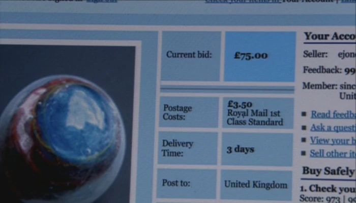 At lunch, Linda fills in some of the missing pieces of Eugene's last weeks. A few weeks before, Eugene was depressed. When Linda came into work one day after an argument with her boyfriend, Eugene agreed to help her move to Australia to start a new life. He told Linda he would sell his alien artefact. When he brought the eye to his office, a few of his friends laughed; ignoring them, though, he still placed it on eBay. The price soon climbed to £15,005.50. Gwen's phone rings. It is Eugene's mother asking Gwen to come by. She thanks Linda and leaves.