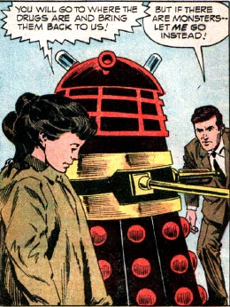 The Daleks confront Dr. Who and Susan. (TV: Dr. Who and the Daleks, PROSE: Peaceful Thals Ambushed!)