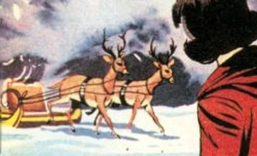 The Doctor, their companions and acquaintances occasionally encountered reindeer — and, indeed, Santa Claus himself. Once, Santa sent a sleigh pulled by reindeer to Dr. Who, John and Gillian to take them to his house. (COMIC: A Christmas Story [+]Bill Mevin, TVC comic stories (Polystyle Publications, Ltd., 1965-1966).)