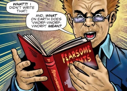 The duo then go to Abbott's reading of Fearsome Frights. He begins reading about a boy named Sammy Jones, who is being surrounded by zombies. A blue box materialises between Sammy and the zombies. Abbott exclaims, "What?! I didn't write that!", and the two seats which previously held the Doctor and Eliza are empty.