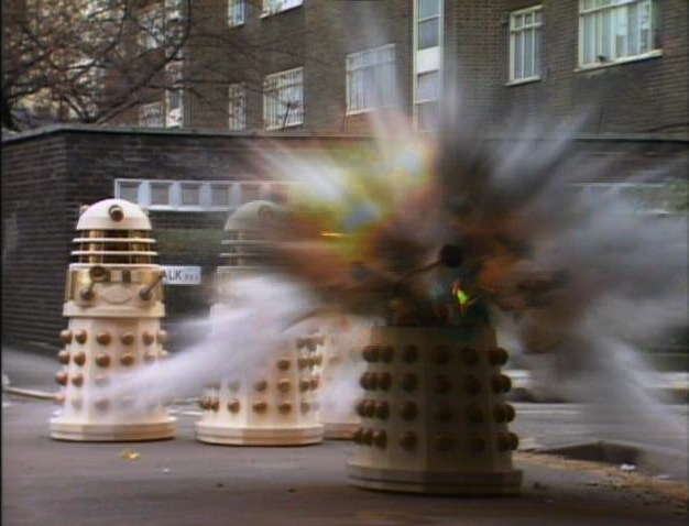 On Earth, the Doctor talked the last Renegade Dalek, the Black Dalek Leader, into self-destructing. (TV: Remembrance of the Daleks) However, Judith Winters, the young girl linked to his mind, was broken mentally for the rest of her life. (PROSE: In the Community)