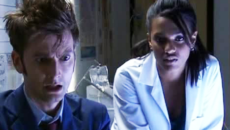 Examining the Slab, Martha wonders if it comes from another planet; the Doctor denies it, explaining it's a basic drone. Solid leather all the way through; "Someone has got one hell of a fetish." Pulling out his sonic screwdriver from the X-ray machine, the Doctor discovers the emitter portion has been destroyed. He expresses sorrow over losing his favourite toy, but promptly tosses it away when Martha calls him "Doctor" for the first time. Martha tells the Doctor about Florence, and he realises that she is an internal shape-shifter who was drinking the blood to assimilate it and mimic human biology in order to trick the Judoon. He decides they need to find her before the Judoon can get a scan in, but it's too late. Florence has passed their scanning.