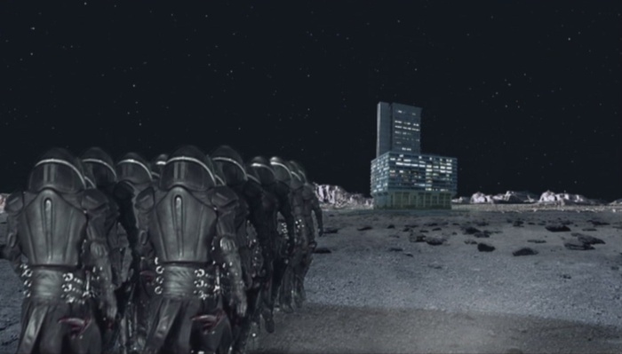 Martha then realises that the air in the hospital is all the air they have; over a thousand panicking people are inside, and will use up all the air in no time. Why would anyone isolate them to the moon and leave them to suffocate? As Martha ponders this, the Doctor tells her she can ask them herself as three huge cylindrical ships appear overhead and land outside the hospital. Black armoured soldiers march out in several long lines, and the Doctor grimly identifies them as the Judoon.