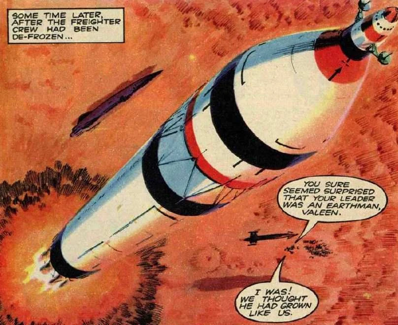 A space freighter was hijacked by Batmen in early 2065, who put the crew into a kind of "frozen sleep" and kept the freighter on an asteroid while under the leadership of a human pretending to have become a Batman. After he was found out as a fake, the crew were unfrozen, and flew away. (COMIC: The Batmen)