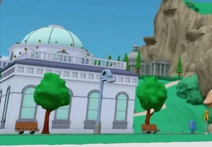 A white cuboid-shaped building with various windows, small gold and silver objects floating on top of it, and wooden benches close to it, was present in a city titled "SP_ING__EL_" when E.T. ran through it. (WC: Supergirl Meets E.T.)