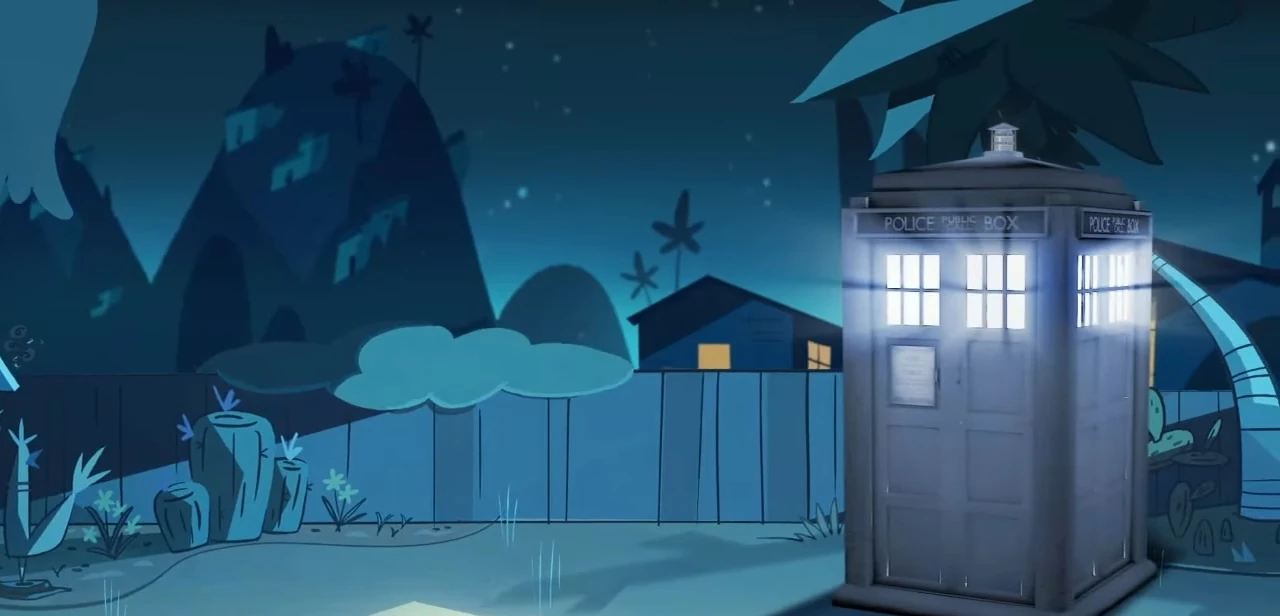 The TARDIS in the Diaz Household garden. (TV: Untitled [+]Disney XD promotional videos Disney XD promotional video (Disney XD, 2015).)