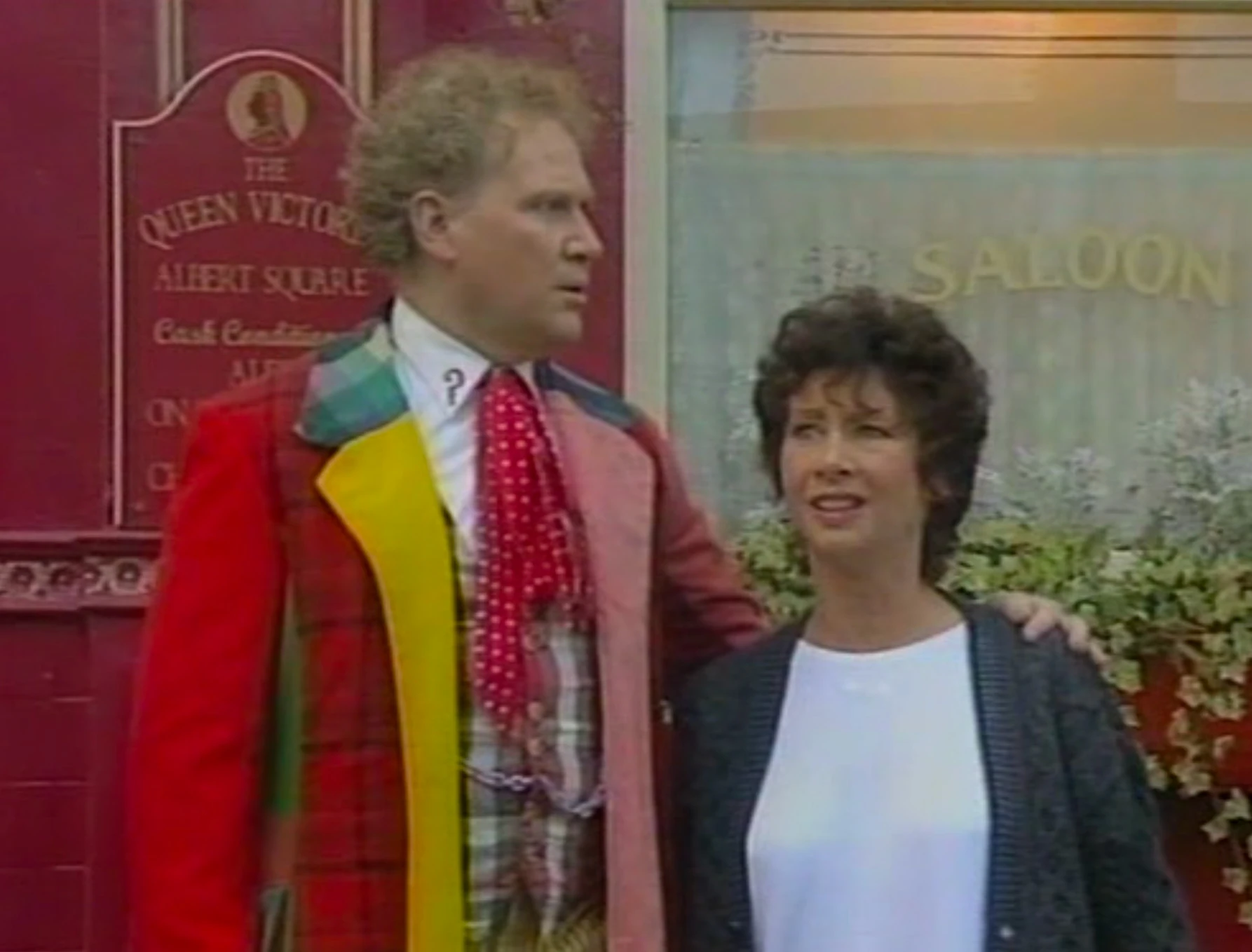 Susan, pulled out of her own time, encounters the Sixth Doctor in London's East End, 1973. (TV: Dimensions in Time [+]John Nathan-Turner and David Roden, Doctor Who 30th anniversary special (BBC1, 1993).)