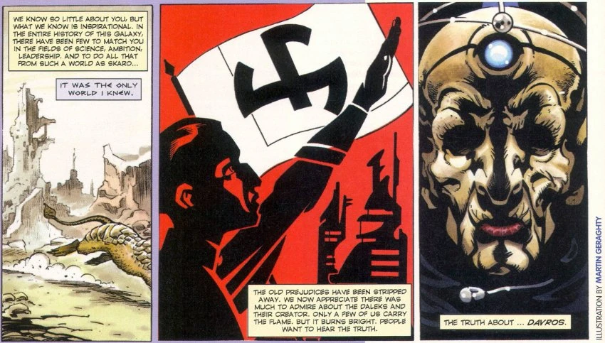 - In DWM 335, Martin Geraghty's preview of the Big Finish audio story Davros features Davros saluting a symbol heavily reminiscent of a rounded swastika, emphasising the influence of the Nazis on the Daleks.