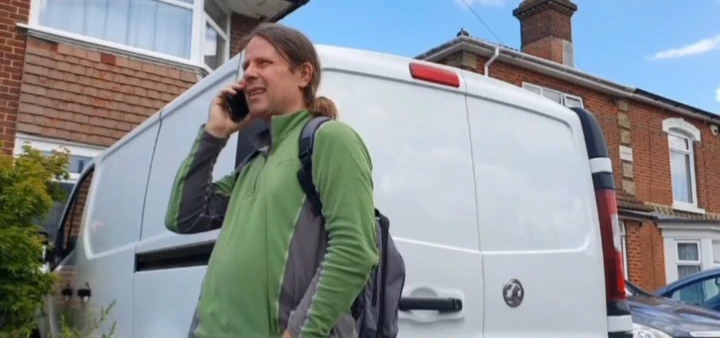 Giles wearing a green and grey sweatshirt. (WC: Mission: Find Lilith [+]Trevor Spencer, Hellscape (BBV Productions, TikTok and YouTube, 2023).)
