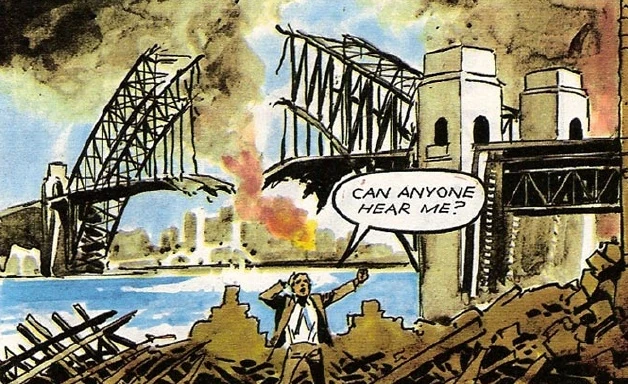 In the 1970s, a man stumbles around near the Dalek-destroyed Sydney Harbour Bridge. (COMIC: *Sub Zero)