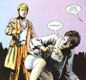 To persuade the Mekon to donate money to charity, Tegan and the Doctor went with the First, Second, Third, Fourth, Sixth and Seventh Doctors, as well as Susan Foreman, Victoria Waterfield, Leela, K9 Mark I and Ace to 1991, where the Second Doctor hit the Mekon in the face with a box of red noses. (COMIC: Comic Relief Comic)