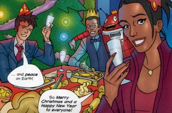As the Sycorax fled, Prime Minister Harriet Jones ordered their ship destroyed, killing the Sycorax. Enraged that Harriet would execute a retreating enemy, the Doctor whispered, "Don't you think she looks tired", to her aide, bringing about Harriet's premature downfall. After choosing his new outfit, the Doctor had Christmas dinner with Mickey and the Tylers, (TV: The Christmas Invasion) and then went to join the celebration in Trafalgar Square. (TV: Love & Monsters)