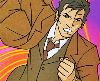 Rose Tyler compared the Tenth Doctor's appearance to the earnest singer of a boy band from the early 2000s. (PROSE: He's Behind You)