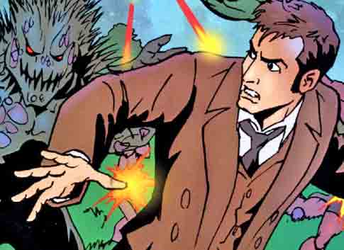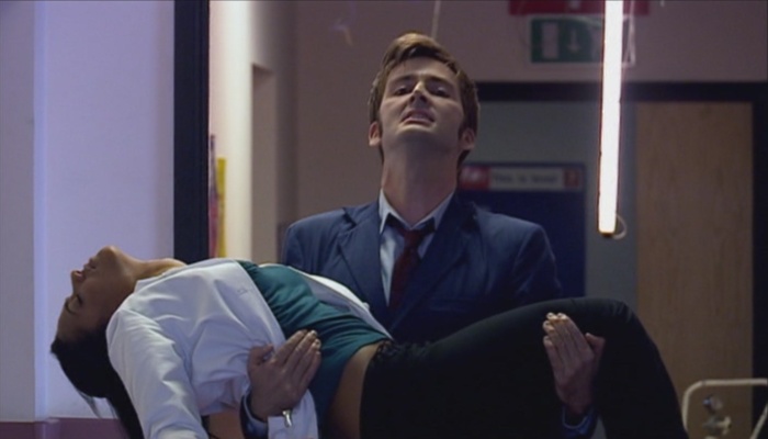 With his height and build, the Tenth Doctor was extremely nimble and quick on his feet, keeping ahead of significantly faster opponents with ease. (TV: Tooth and Claw, The Lazarus Experiment) He could even outrun and dodge a crane. (TV: Planet of the Ood) Despite his nimble stature, the Doctor was very strong, managing to easily yank the Sycorax leader's electric whip from his grip and snap it in half, (TV: The Christmas Invasion) free Morvin Van Hoff from the grip of a damaged Heavenly Host, (TV: Voyage of the Damned) rip off Lucius Petrus Dextrus' stone arm, (TV: The Fires of Pompeii) hold off a Cyberman with a sword, (TV: The Next Doctor) and lift a grown woman and throw her away from danger in such a way that she landed on her feet. (COMIC: The Arts in Space) He could even hold his own weight and manoeuvre across a beam with just his hands gripping to it. (TV: Forest of the Dead) However, he could be knocked down from a direct blow to the head, (TV: The Idiot's Lantern, Forest of the Dead, The End of Time) and was unable to escape from the hold of artificial opponents without aid. (TV: Smith and Jones, Voyage of the Damned)