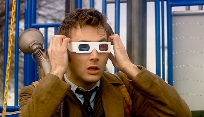 Another part of the Doctor's attire was a pair of dark tortoise-shell rectangular frame glasses, (TV: Tooth and Claw) which he called his "brainy specs". (TV: Time Crash) He required them due to becoming long-sighted after his regeneration. (PROSE: The Christmas Invasion) While on San Helios, the Doctor used his sonic screwdriver to darken the lenses to effectively turn them into sunglasses. (TV: Planet of the Dead)