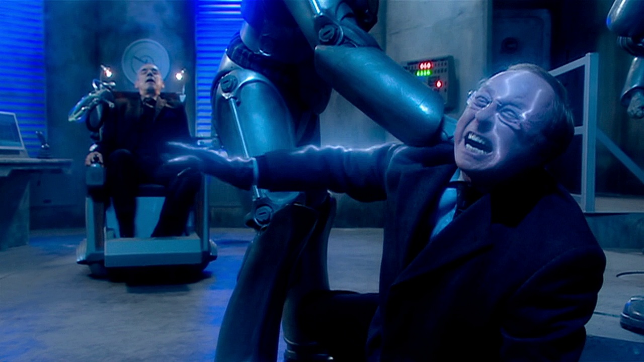 The Cyberman on the Zeppelin comes to life in response to the silent alarm and tries to kill Mickey and Jake. Mickey goads the Cyberman into punching him, ducking out of the way at the last second so it punches through the steel plate protecting the transmitter control instead. Electricity crackles through the Cyberman's body and it falls at the same time the transmission is cut off.