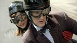 In the TARDIS, Clara drinks her tea to calm her nerves; she asks the Doctor when he's going to explain things to her. He says at breakfast, to which she says she doesn't want to wait that long. He tells her the TARDIS is a time machine; she doesn't have to wait. He lands the TARDIS and walks outside into daylight, taking applause from a crowd who seem to think the materialisation was a performance art. He has Clara hold a hat to collect money for their meal. He goes back into the TARDIS, looking for the garage; he arrives outside the TARDIS moments later on a motorbike.