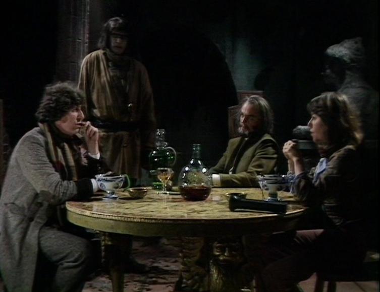 The Doctor and Sarah arrive at Solon's castle. Solon greets them awkwardly, remarking on the Doctor's "magnificent head". He orders Condo to bring wine. The Doctor recognises Solon as a distinguished scientist, a genius in the field of organ and tissue transplantation. His reputation was wrecked by his rumoured connection to the followers of Morbius, a notorious Time Lord criminal.