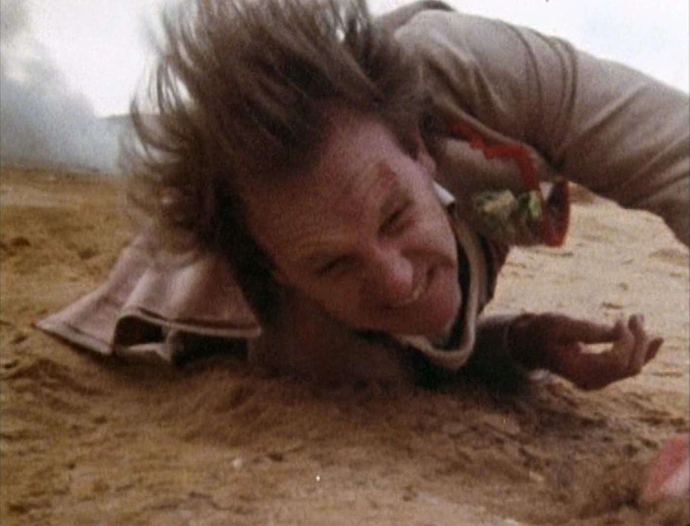 The ship's rocket pods fire at the last moment, throwing Stotz's aim off and allowing the Doctor to violently land the ship on the surface of Androzani Minor. Still experiencing the effects of the Spectrox poisoning, the Doctor escapes from the spaceship. Krelper and another gun runner chase after him. Meanwhile, General Chellak plans the real assault on Jek's base, making him believe an attack lies elsewhere. As the assault force, guided by Salateen, heads towards the base, they come to a hold as they run into an android. Salateen assures them that there is nothing to fear, as the belt buckles will protect them, but as he moves towards the android to prove this, he is immediately gunned down. Panic erupts in the ranks as the soldiers realise that the signal is not working, and they frantically return fire. They eventually manage to disable all of Jek's androids, but at a very high cost of lives. Meanwhile, Krelper and his cohort are still chasing the Doctor. He approaches a cliff and falls from it. Rendered helpless for a moment, he is unable to get up as Krepler and the other gunrunner approach him, but just as they are about to kill him, a mudburst begins and they decide to leave the Doctor be and retreat to the safety of the ship. The Doctor gets to his feet and makes his way into the caves to save Peri.