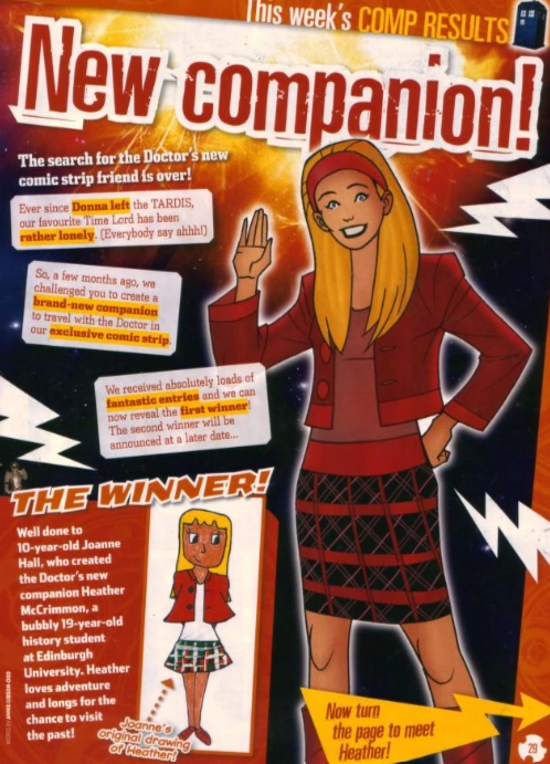 - The character of Heather McCrimmon was created as part of a create-your-own-companion competition held by Doctor Who Adventures. There were two winners chosen in total with Heather's creator - ten-year-old Joanna Hall - being revealed first in this issue. The second winner - twelve-year-old Hamish Gough - was revealed in DWA 122 with his companion Wolfgang Ryter appearing from Flight of the Giurgeax onwards.