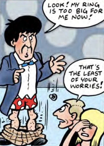 The first moments of the Second Doctor were beset with problems. Shortly after his regeneration, he complains that his ring no longer fits his finger, with Ben adding that that's the least of his problems as the Doctor's trousers also fall down. Later, the Doctor's hat is knocked off his head as he exits the TARDIS. Later still, he attempts to join the Beatles, who tell him that, while he has the right haircut, they are not looking for a recorder player.