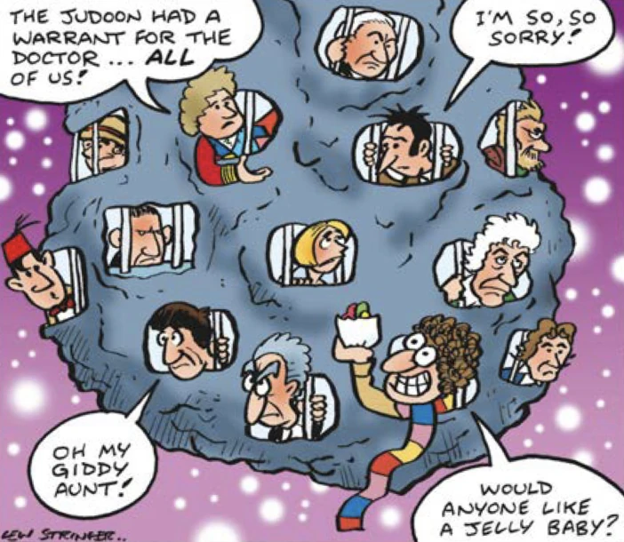 - The Fourth Doctor offers jelly babies to his counterparts.