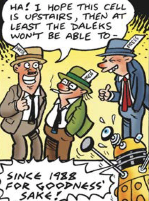 This strip takes a look at some of the other prisoners of the Judoon space jail. There is a sarcastic Ice Warrior, a Silent who appears to be on hunger strike (but is actually just not being fed because the guards keep forgetting they're there), and the most infamous and most deserving of their incarceration; the journalists who still write jokes about Daleks being unable to climb stairs.