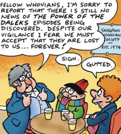 At a meeting of the Skegpool Whovian Society, one member regretfully informs his two comrades that there has been no news of the lost episodes of the Doctor Who serial, The Power of the Daleks being discovered, and that it was time to accept that they have been lost forever. One of his comrades insists that he has not given up hope, believing that someone somewhere out there may have them. Meanwhile on Skaro, the Dalek Film Club are revealed to have the film reels in their position, and are in the process of watching them.