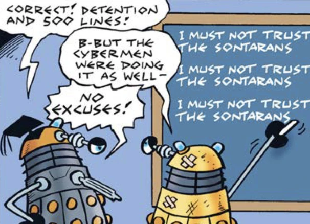 At the Dalek Academy on Skaro, a Dalek commander is berating their scuffed up student. The commander asks; "what's the first thing you were taught?". "Daleks are the supreme rulers of the universe" his student responds. The commander continues; "and what should we never do because it always ends badly?". "Join an alliance" the student responds sheepishly. "Correct!" the commander responds angrily, before he gives the student detention and 500 lines. The student proceeds to repeatedly write "I must not trust the Sontarans" on a blackboard, as he insists: "the Cybermen were doing it as well", to which the commander screams "no excuses!"