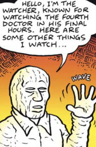 The Watcher, who is known for watching the Fourth Doctor in his final hours, introduces himself and his previously untold adventures. He tells the readers about the other things he watches, which includes television, the footie and, mostly, his weight, as he asks a greengrocer for a fresh stick of celery, which the Watcher believes the "next Doctor" will appreciate.