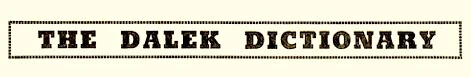The Dalek Dictionary was one of the features original to The Dalek Book, a Dalek annual published in 1964, which were not so much a story as an informative feature on Dalek society. Although mostly non-narrative, it featured a wealth of new information about Dalek language and culture, as well as other worldbuilding details about ancient Skaro.