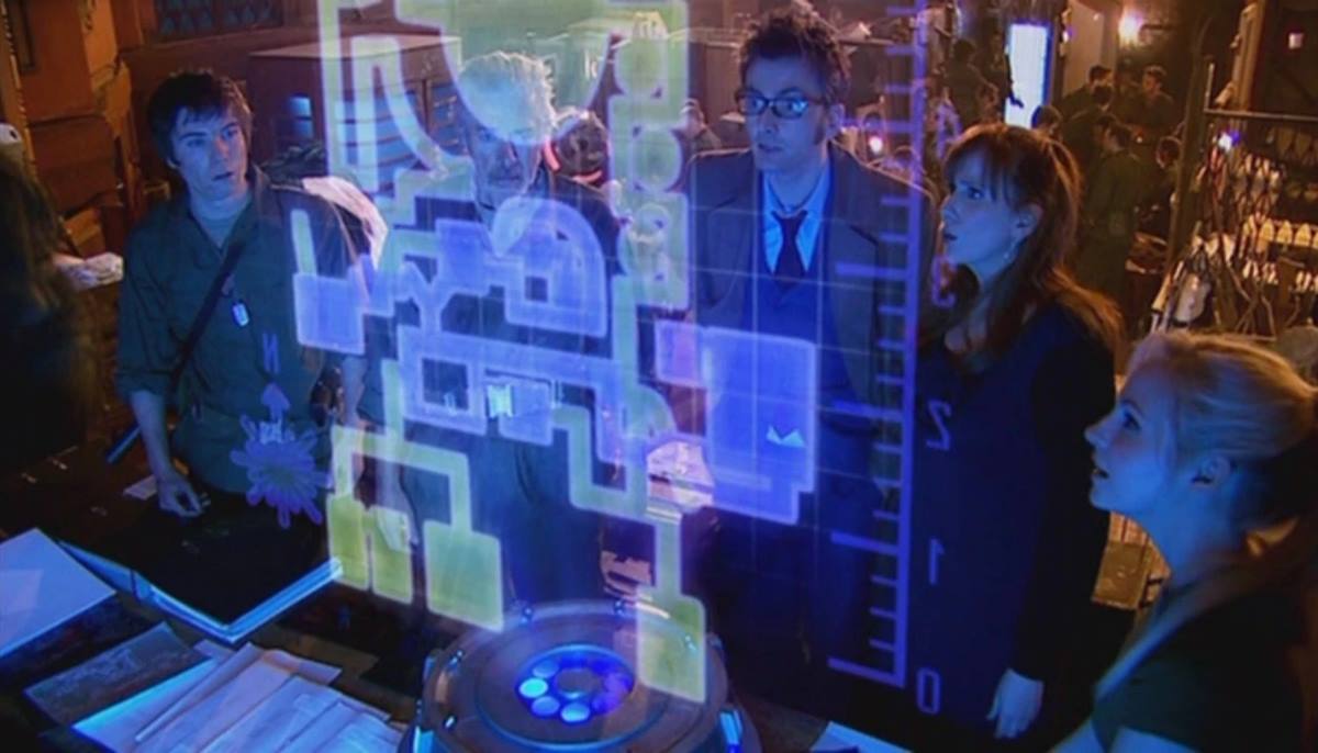 Back at the human camp, the Doctor wonders if the map covers the Hath part of the city as well, which Cline answers yes; he says it will help them find Martha. Cline says they have more important things to do, but when it's morning, they can use the machines to create a platoon. Donna is mortified at the idea of using a machine to have offspring, apologising to Jenny as she does not see her as a real person. Jenny defends herself by saying she has free thought and will, making her just as real as Donna and the Doctor, wondering how they differ. Cobb shows pride in Jenny, wishing he had more soldiers like her. Yelling in success, the Doctor explains there's a suppressed layer of information and uses his sonic screwdriver to reveal a previously unknown route to the Temple where the Source is located.